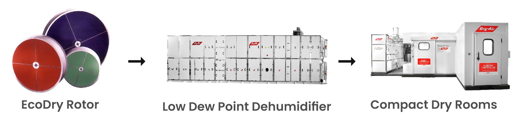 Bry-Air’s Low Dew Point Dehumidifiers ensure recommended Dry Room conditions for lithium battery manufacturing, safety glass, automotive hybrid batteries, medical devices, very low RH Pharma production and a selective few other niche applications like special grade coloured nylon blended bottles, etc.